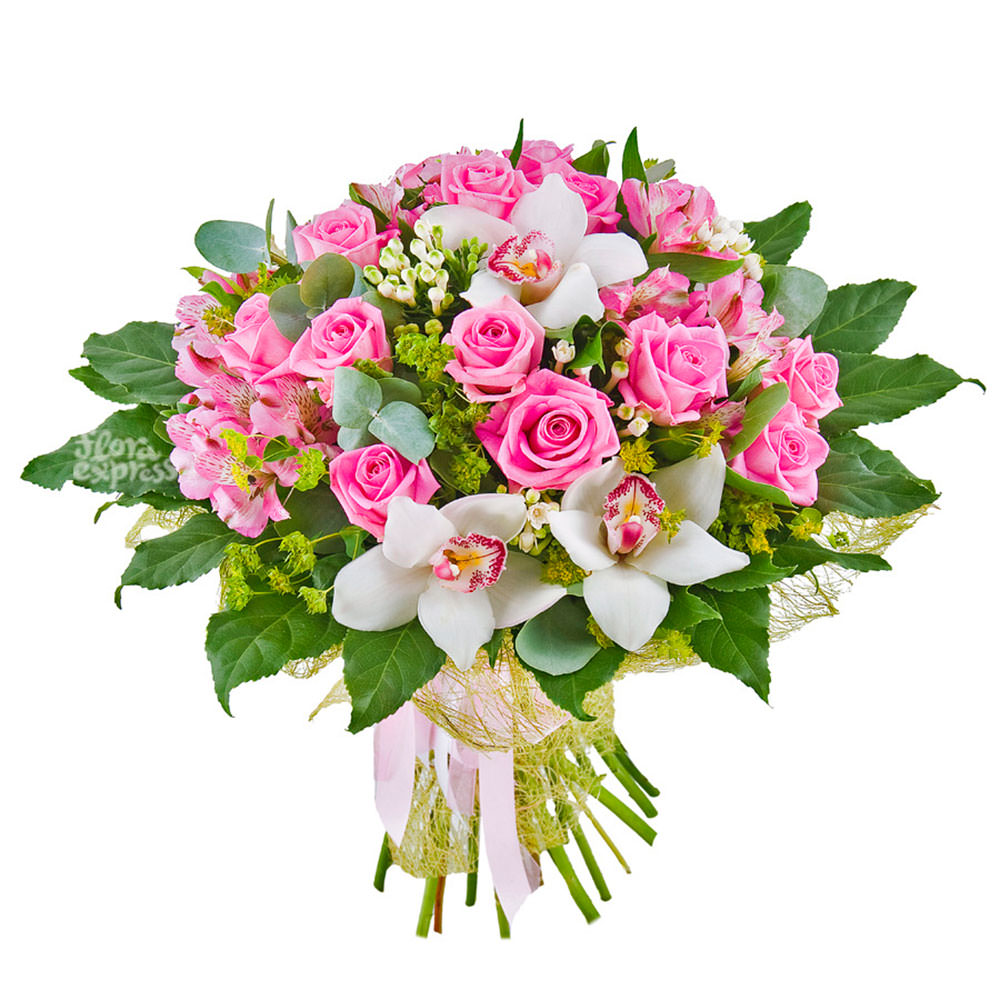 Роза одноголовая, орхидея, альстромерия, бруния, эвкалипт.